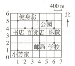 (3)上周日,小轩从家出发后的路线依次是$(5,4)→(2,3)→(4,3)$,依次写出他去的地方。