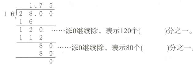 用28除以16商1,余12,商1写在()位上,点上小数点,在余数12的后面添加0继续除,表示120个()分之一;在()位上商7,余8,在8的后面添加0继续除,表示80个()分之一;在()位上商5。