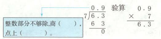 用被除数$6.3$的整数部分$6$除以$7$,不够商$1$,在个位上商(),点上(),个位上的$6$与十分位上的$3$合起来,表示$63$个()分之一,除以$7$,商是$9$个()分之一,在()位上商$9$。