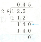 1. 如图是算式$12.6÷28$的竖式计算过程,箭头所指的“$140$”表示的是$140$个( )。