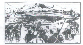 第一步: 材料所示图片信息:队列整齐的军队、举着“实行三三制”大旗的群众、陆续而来的群众都在“参议会”前的场地集合