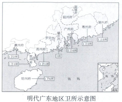 5. 明代广东下辖十府(如图所示),共有 8 卫 28 所,除肇庆府下无海防卫,其余府下至少有 1 海防卫,卫下再下辖各千户所。明代广东地区卫所的设立(
