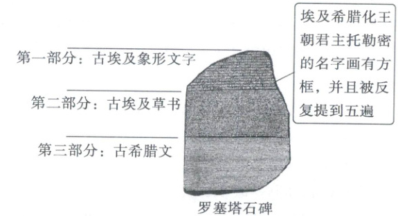 11. “罗塞塔石碑”(如图)是托勒密五世于公元前 196 年颁布的一篇有关神庙祭祀的诏文。这可用于佐证当时埃及(