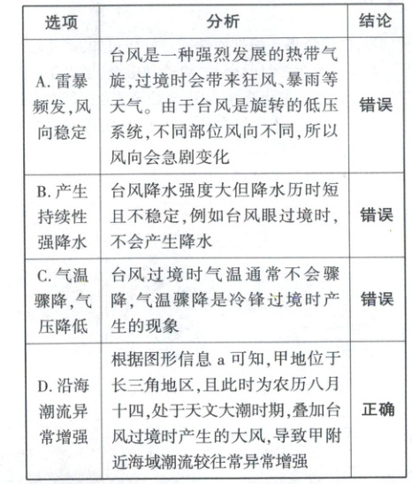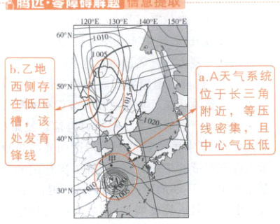 判断A天气系统在甲地过境时产生的天气现象,应首先判断A天气系统的类型,根据图形信息a可知,A天气系统等压线密集,且中心气压低,发生位置位于海洋附近,可推断A天气系统为台风。
