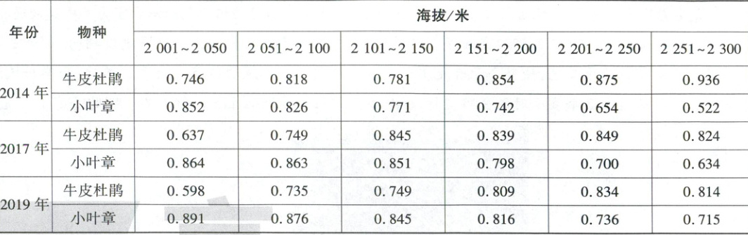孤岛化现象是物种、生态系统和景观等地理事物陷于孤立式发展的状态,与周边区域的偏离和隔离不断强化。牛皮杜鹃属极地特有物种,长白山高山苔原带和岳桦林带均有分布且存在基因交流。近年来,受气候变暖等影响,长白山高山苔原出现了小叶章等草本植物上侵的现象,研究表明,整个长白山西坡苔原带主体海拔 2 001~2 300 米范围内均受到草本植物入侵影响,牛皮杜鹃出现孤岛化趋势。下表示意 2014—2019 年长白山不同海拔牛皮杜鹃和小叶章生态位宽度。(生态位宽度指生物所能利用的各种资源的总和,能够反映一类生物的资源利用能力高低)