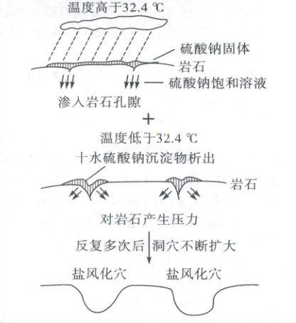 (2)大型砾岩洞穴:①砾岩颗粒分选性差,透水性强,孔隙较大且不均匀,盐溶液沉淀物更易在适宜温度下大范围析出;(2分)②随着盐风化不断加强,凹坑不断扩大,形成大型风化洞穴。(2分)