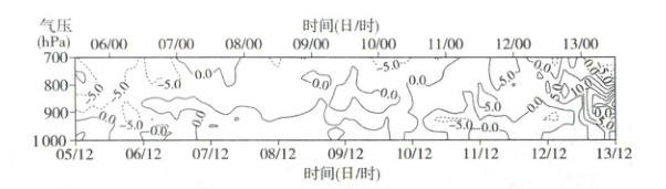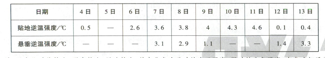某年 1 月 4—13 日我国某城市经历了一次持续性雾霾天气过程,本次雾霾天气经历了“轻雾(4—5 日)—雾霾(6—12 日)—雾(13 日)”3 个阶段,研究发现较高湿层厚度对大雾或浓雾的形成和维持有利,但不利于霾的维持,当大气湿度增加时,霾可以转化为雾。下图示意 1 月 5 日 12 时—13 日 12 时该城市涡度时间—高度剖面(单位:×10⁻⁵s⁻¹),下表为 1 月 4 日—13 日 8 时该城市探空站逆温强度。据此完成 12~13 题。