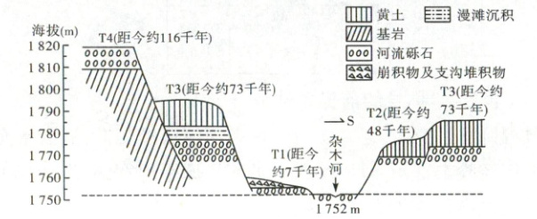 拔河高度指河流阶地高于现代河床的相对高度。杂木河地处我国西北干旱区,是石羊河八大支流之一,发源于祁连山北侧。下图示意杂木河某河段河流阶地剖面图。据此完成 14~16 题。