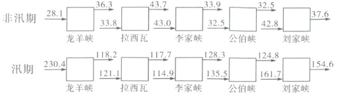 6. A 流域内部协作开发水资源、保护环境的意义【解析】根据材料“溶解性有机碳……输入水库后一部分被截留,一部分输出至下游河流”及图示信息可知,截留量=输入量-输出量,结合图形数据可分别计算出各水库汛期与非汛期的溶解性有机碳截留量(如下表)。
