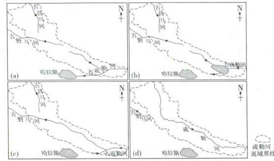 图b 古疏勒河不再注入哈拉湖,且流程变短,说明此阶段受地壳运动影响,古疏勒河源头地区相对下陷,其西南部相对抬升,阻挡了疏勒河的西流