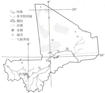 马里共和国位于非洲西部,尼日尔河从该国南部流过,南部稀树草原的河谷地带人口稠密,北部沙漠广布,人烟稀少。下图为马里区域示意图。据此完成 15~16 题。