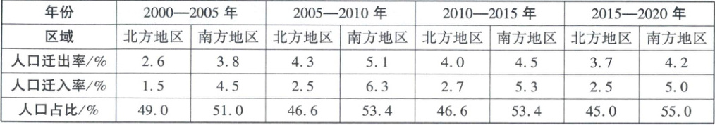 人口迁移是区域人口结构、城镇化进程和社会经济发展水平的重要影响因素。随着我国改革开放的推进,大量人口迁入东部地区,但近年来,我国人口迁移格局发生变化。下表为 2000—2020 年我国南、北方地区人口迁移格局和空间分布。据此完成 3~5 题。