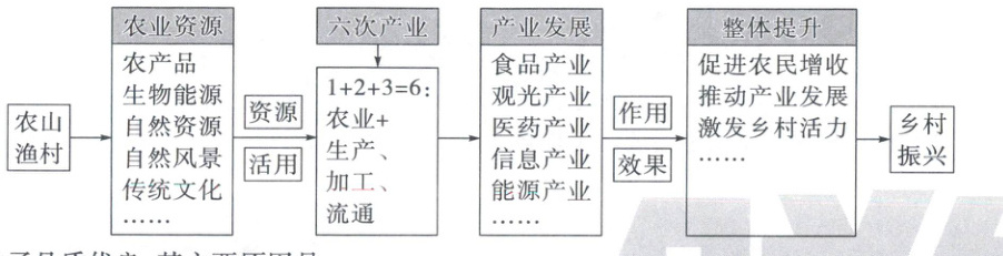 马路村位于日本高知县的深山坳中,群山环绕,森林覆盖率高达 96%,被誉为“森林的村庄”。该村仅有一条县道连接外部,老龄化严重,曾一度濒临消失。如今依靠一颗颗天然高品质柚子发展六次产业,撬动了乡村振兴。下图为“六次产业模式图”。据此完成 1~2 题。