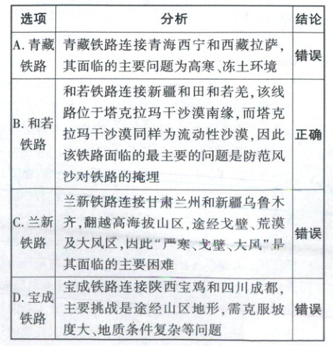 本题实质是分析该铁路沿线环境与选项中我国铁路沿线环境相似的区域,即两地自然环境相似,所面临的建设困难也相似,可以沿用积累的经验。根据材料“是非洲首条沙漠重载铁路,且途经的沙漠具有流动性”及图示经纬度信息可知,该线路位于撒哈拉沙漠地区,气候炎热干燥,途经流动性沙漠,因此面临的主要困难为高温和风沙活动。