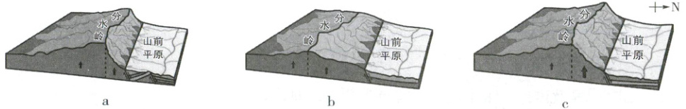 12. D 内力作用及其表现形式 【解析】根据材料“分水岭迁移是在构造运动和气候变化等因素影响……其迁移对地貌演变、河流形态及沉积物传输有重要影响”、图示信息及所学内力对地表形态变化的影响知识可知,在分水岭迁移过程中,分水岭通常会向侵蚀较弱或抬升较快的一侧迁移,且迁移过程具有连续性。根据图示信息可知,图b时期分水岭海拔最低,说明图b时期地质构造运动强度较小,且山前平原地层较简单,分水岭偏南,应为初始时期;随着构造隆升强度增强,迎风坡(南坡)降水增加,侵蚀能力显著强于背风坡(北坡)。侵蚀强的一侧河流下切更深、溯源侵蚀更快,导致分水岭开始向侵蚀较弱的一侧迁移,对应图c;与图c时期相比,图a时期构造运动仍为持续抬升,山前平原沉积层出现了倾斜隆起,导致山体南侧溯源侵蚀作用持续增强,分水岭向侵蚀弱的一侧(北侧)进一步迁移,最终形成连续的迁移过程,D项正确。