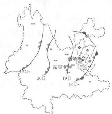 某年 2 月 19 日至 23 日,滇中及其以东地区出现强降温降雪天气,其中曲靖出现了中到大雪、局部暴雪或大暴雪,而云南西南部降雪相对较少,区域内降雪呈现多层次的特点。研究表明,此次强降雪天气的形成主要是阻塞高压引起的冷锋南下和盛行西风异常引起南支槽(强低压槽)北移,导致昆明准静止锋动态平衡机制破坏。下图示意 2 月 18 日—2 月 23 日降雪区域和昆明准静止锋锋线动态变化。据此完成 15~16 题。