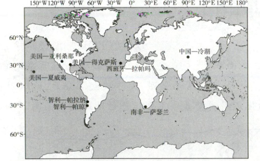 当地时间 2025 年 6 月 23 日,位于智利北部塞罗帕琼山的维拉·鲁宾天文台公布了首批星空照片,在约 10 小时的测试观测中,捕捉到了数百万个星系和恒星。该天文台计划使用 8.4 米口径的西蒙巡天望远镜和世界最大的数码相机每三天完成一次全天巡天(对整个南半球夜空进行一次完整扫描)。下图示意全球 8~10 米口径光学望远镜分布图。据此完成 15~16 题。