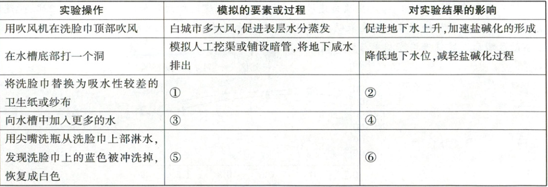 (2)本题考查水循环的过程及其地理意义。解答本题首先要判断每个实验操作模拟的真实要素或水循环环节,再根据该要素或环节在盐碱地形成和治理中的作用,推测其对实验结果的影响。根据材料及表格信息可知,卫生纸或纱布与洗脸巾质地差异较大,其吸水性较差,含有色素和碳酸氢钠的水难以像在洗脸巾上那样顺利到达顶部,顶部结晶析出量会减少,此操作模拟的是通过改变土壤质地来影响地下水的向上运移过程,使地下水难以到达土壤表层,水中的盐分难以向上运移,不利于盐碱土的形成;向水槽中加入更多的水,模拟的是不合理灌溉等,会导致地下水位升高,使得实验中更多含有蓝色色素和碳酸氢钠的水到达洗脸巾顶部,析出更多白色晶体,对应含盐分的水分更易到达土壤表层,从而加速盐碱化过程;用尖嘴洗瓶从洗脸巾上部淋水,模拟的是降水或灌溉过程,实验中洗脸巾的蓝色色素被冲刷掉,逐渐恢复白色,对应土壤中的盐分随水的淋溶作用向下迁移,降低土壤的盐碱度。
