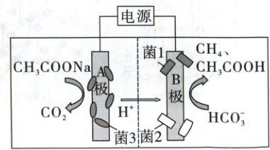 阴极区 B极 $HCO_3^- + 8e^- + 9H^+ = CH_4↑ + 3H_2O$、$2HCO_3^- + 8e^- + 10H^+ = CH_3COOH + 4H_2O$