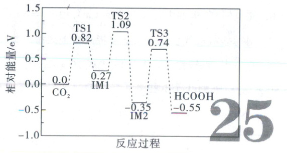 12. A 能量图分析 【解析】决速步是反应中活化能最大的步骤,生成HCOOH的路径中,CO₂→IM1、IM1→IM2、IM2→HCOOH各步活化能分别为0.82eV、0.82eV、1.09eV,最大活化能为1.09eV,经历TS1、TS2、TS3三个过渡态,故包含3个基元反应,A正确,D错误;能量越低物质越稳定,故TS1比TS2更稳定,B错误;催化剂只能降低活化能,不改变反应的焓变,C错误。