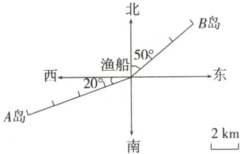 (2) $B$岛在渔船的偏 方向上,距离是km。