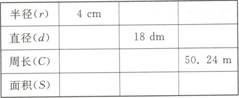 半径(r) 4 cm 9 dm 8 m 直径(d) 8 cm 18 dm 16 m 周长(C) 25.12 cm 56.52 dm 50.24 m 面积(S) 50.24 cm² 254.34 dm² 200.96 m²