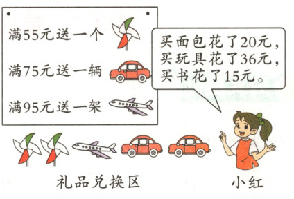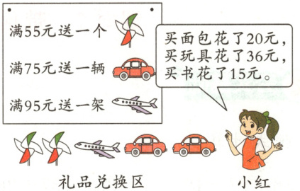 小红可以兑换什么礼品?请你从礼品兑换区中圈一圈,并把你的想法写一写。