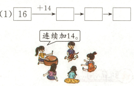 (1) $\begin{matrix} 16 \\ \end{matrix}$ $\xrightarrow{+14}$ $□$ $\xrightarrow{}$ $□$ $\xrightarrow{}$ $□$
