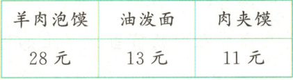 9. 【文化渗透】周末,张叔叔来西安游玩,品尝了西安的特色美食,羊肉泡馍、油泼面和肉夹馍(如下表),他购买这些食物一共花了多少元?
