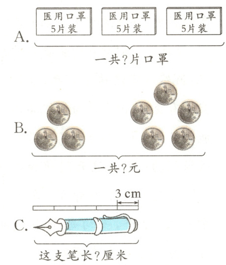 2. 下面哪个问题可以用 $3×5$ 解决?( )。