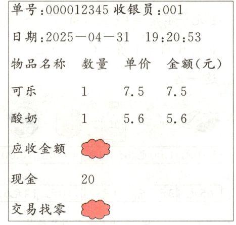 8. 【新考向】妈妈在购物后不小心把小票弄破了,请你仔细看一看,算一算。