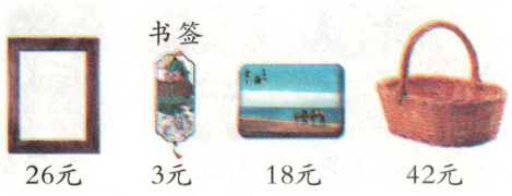 例:可能买了相框和书签,一共花了26+3=29(元),还剩50−29=21(元);可能买了相框和风景冰箱贴,一共花了26+18=44(元),还剩50−44=6(元);可能买了书签和风景冰箱贴,一共花了3+18=21(元),还剩50−21=29(元)。可能买了书签和竹提篮,一共花了42+3=45(元),还剩50−45=5(元)。