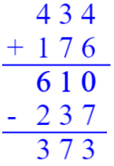 $434 + 176 - 237 =$ $899 - (370 + 250) =$ $1000 - 410 - 328 =$