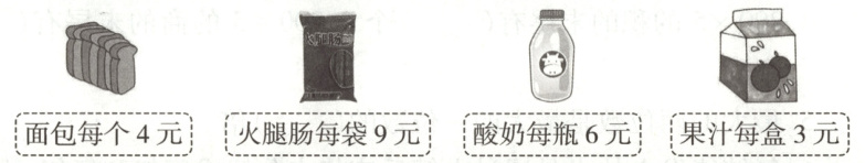 (1) 请你帮他们算一算,买 4 袋火腿肠的钱可以买多少盒果汁?(4 分)