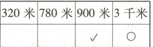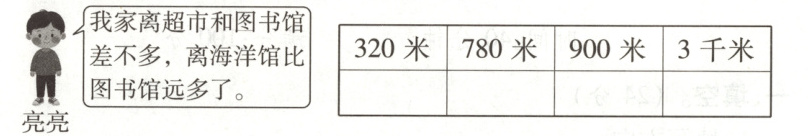 1. 亮亮家离图书馆 890 米,亮亮家离超市有多远?画“√”。亮亮家离海洋馆有多远?画“○”。(5 分)
