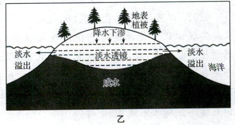 材料二 淡水透镜在珊瑚礁地区较为常见,是一种形如放大镜镜片的地下淡水体,中央厚、边缘薄。淡水透镜中,比重较小的入渗雨水一般覆盖于咸水层之上。淡水透镜这种特殊的地下淡水是岛礁上的宝贵水资源。乙图为淡水透镜构造示意图。