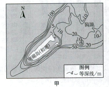 材料一 环礁是热带海洋中一种巨大的珊瑚礁,礁体上会堆积珊瑚砂等沉积物,并逐渐形成“上土下岩”的二元地质结构,可能发育成珊瑚岛。甲图为我国南沙永暑礁及周围海域示意图。