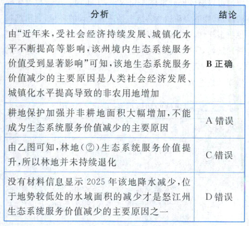 (易错易混)怒江州位于云南省西北部,全州 98%以上面积为山地。2023 年末下辖泸水、兰坪、福贡和贡山一市三县,人口分别是 19.8 万、18.9 万、11.1 万和 3.8 万。近年来,受社会经济持续发展、城镇化水平不断提高等影响,该州境内生态系统服务价值受到显著影响。下图为怒江州区划图(甲图)及怒江州 2019 年与 2025 年(预测情况)四种主要土地利用类型生态系统服务价值(单位:亿元)的对比图(乙图)。据此完成 9~11 题。