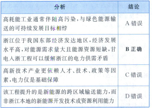 6.B 陇电入浙工程从甘肃(陇)到浙江,需穿越黄土高原(水土流失严重)、秦岭(山地地形复杂)等生态脆弱区,施工需兼顾环境保护和地形挑战,B正确。工程途经陕(陕西)、豫(河南)、皖(安徽)等,不经过晋(山西)和赣(江西),C错误。工程输送的是电力(新能源为主),非重化工业转移,且产业转移方向通常是东部向中西部转移,D错误。