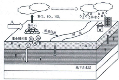 1.C 煤矸石露天堆放,阻碍了土壤的透气性,A错误。风力作用会形成粉尘,但粉尘可能通过凝结核作用增加降水概率,年降水总量可能会增加,B错误。煤矸石含重金属,受雨水淋溶后会污染水和土壤,加剧环境污染,C正确。土壤盐碱化与气候干旱有关,与酸雨无关,D错误。