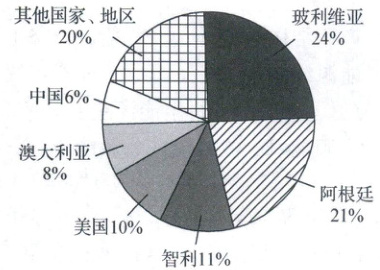 (2025 陕西咸阳期中)自然资源部中国地质调查局 2025 年 1 月 8 日宣布,我国锂矿找矿取得一系列重大突破,锂矿储量从全球占比 6%升至 16.5%,排名从世界第六跃至第二,重塑了全球锂资源格局。下图为 2022 年全球锂矿分布统计图。据此完成 1~3 题。