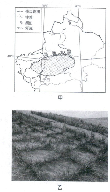 甲图为塔克拉玛干沙漠锁边范围示意图,乙图为