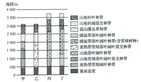 7.D 由材料可知,与神农架相比,太白山的纬度更高,应位于秦岭—大巴山区的北部。由图可知,甲、乙山脉的海拔相同,基带分别为亚热带常绿阔叶林带和亚热带常绿落叶阔叶混交林带,应为神农架的南、北坡;丙、丁山脉的海拔相同,基带分别是暖温带落叶阔叶林带(含常绿树种)和暖温带落叶阔叶林带,南坡为向阳坡,热量更充足,含常绿树种,故丙、丁分别为太白山的南、北坡。故选D。