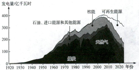 (2025 广东惠州月考)2024 年 9 月 30 日,英国关闭最后一家燃煤电站,结束了 140 年燃煤发电的历史。下图为 1920—2024 年英国的电力结构图。据此完成 13~15 题。