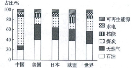 (2025 江苏徐州月考)近年来,全球能源消费结构呈现多样化的趋势,同时受能源禀赋、技术、核事故等特殊事件的影响,能源结构发展具有不确定性。近年来,日本化石能源份额逆向增加,煤炭份额也因此出现回升,而近年来我国的能源自给率快速下降,煤炭在化石能源中所占的比例下降明显。下图示意 2018 年全球及主要国家或地区一次能源消费结构。据此完成 1~2 题。