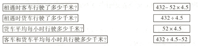 五、(张家口市宣化·期末)甲、乙两地相距432千米,一辆客车和一辆货车分别从甲、乙两地同时出发,相向而行,经过4.5小时相遇。已知客车平均每小时行驶52千米。(连一连)(8分)