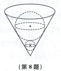8. [2024 重庆北碚月考]如图是一个倒置的圆锥形容器,其轴截面为等边三角形,在其内放置两个球形物体,两球体均与圆锥形容器侧面相切,且两球形物体也相切,则小球的体积与大球的体积之比为
