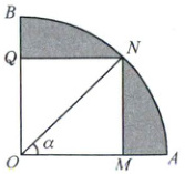 9. [2023 河北唐山期中]如图,扇形 $OAB$ 的半径为 2,圆心角为 $\frac{\pi}{2}$,$N$是弧 $AB$ 上一动点(不包括端点),且 $NM\perp OA$ 于点 $M$,$NQ\perp OB$ 于点 $Q$.设 $\angle MON = \alpha$,将扇形 $OAB$ 绕 $OB$ 所在直线旋转一周,由图中空白部分 $OMNQ$ 旋转形成的几何体的表面积记为 $S$,体积记为 $V$.