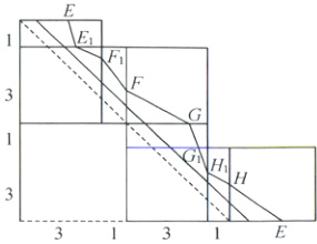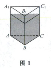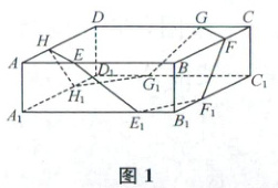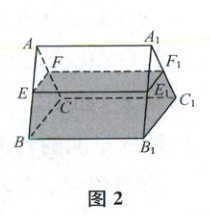 9.4 设正三棱柱的底面积为$S$,高为$h$,则水的体积$V_{1}=3S$.因为$E$,$F$,$F_{1}$,$E_{1}$分别为所在棱的中点,所以$S_{\triangle AEF}=\frac{1}{4}S$,$S_{四边形BCFE}=S_{\triangle ABC}-S_{\triangle AEF}=S-\frac{1}{4}S=\frac{3}{4}S$,所以题图2中水的体积为$V_{2}=\frac{3}{4}Sh$.又$V_{1}=V_{2}$,所以$3S=\frac{3}{4}Sh$,解得$h = 4$,所以该正三棱柱容器的高为4.