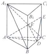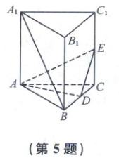 5.$\frac{5}{8}$ 如图,连接A₁C,交AE于点F,连接FD,则平面A₁CB∩平面AED = FD.因为A₁B//平面ADE,且A₁B⊂平面A₁CB,所以A₁B//FD,所以在△CA₁B中,$\frac{CF}{CA_{1}}=\frac{CD}{CB}$,因为$\frac{CE}{EC}=\frac{2}{3}$,所以$\frac{CE}{CC_{1}}=\frac{3}{5}$,由三棱柱的性质,得CC₁//AA₁,所以$\frac{CE}{AA_{1}}=\frac{CF}{A_{1}F}$,即$\frac{CF}{A_{1}F}=\frac{CE}{CC_{1}}=\frac{3}{5}$,所以$\frac{CF}{CA_{1}}=\frac{3}{8}$,即$\frac{CD}{CB}=\frac{3}{8}$,所以$\frac{BD}{BC}=\frac{5}{8}$.